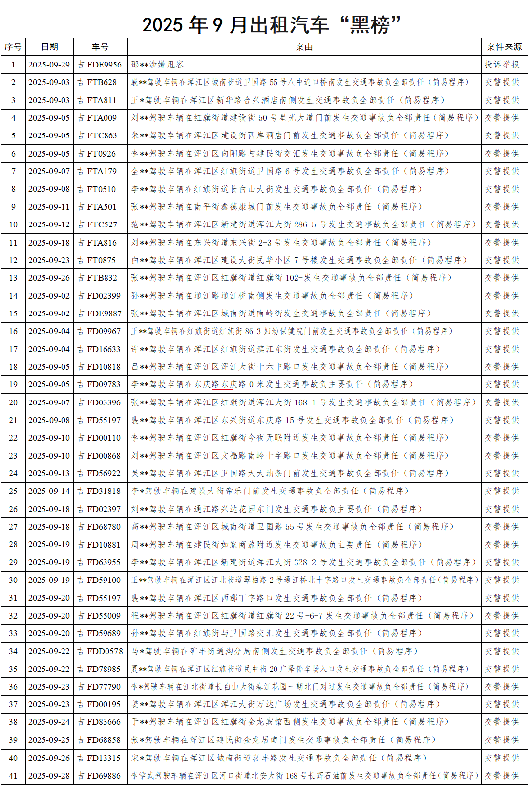 为进一步提升出租汽车行业文明服务水平,现将2025年9月份“城市流动新名片”创建活动情况予以公告:出租汽车“红榜”27人,主动归还丢失物品27人次,其中:归还手机10部,钥匙5把,包1个,身份证4张,其他物品7件;出租汽车“黑榜”41人,其中;驾驶员途中甩客1人,发生交通事故负主要责任以上40人。经调查,9月份市区内出租汽车交通事故66起,其中:承担事故全责38起,占总数57.57%,承担事故主责2起,占总数3.03%。承担次要责任和无责任26起。在此倡导出租汽车经营者及驾驶员要引以为戒,进一步加强教育和培训,自觉遵守相关法律、法规,让安全文明行车成为良好习惯。