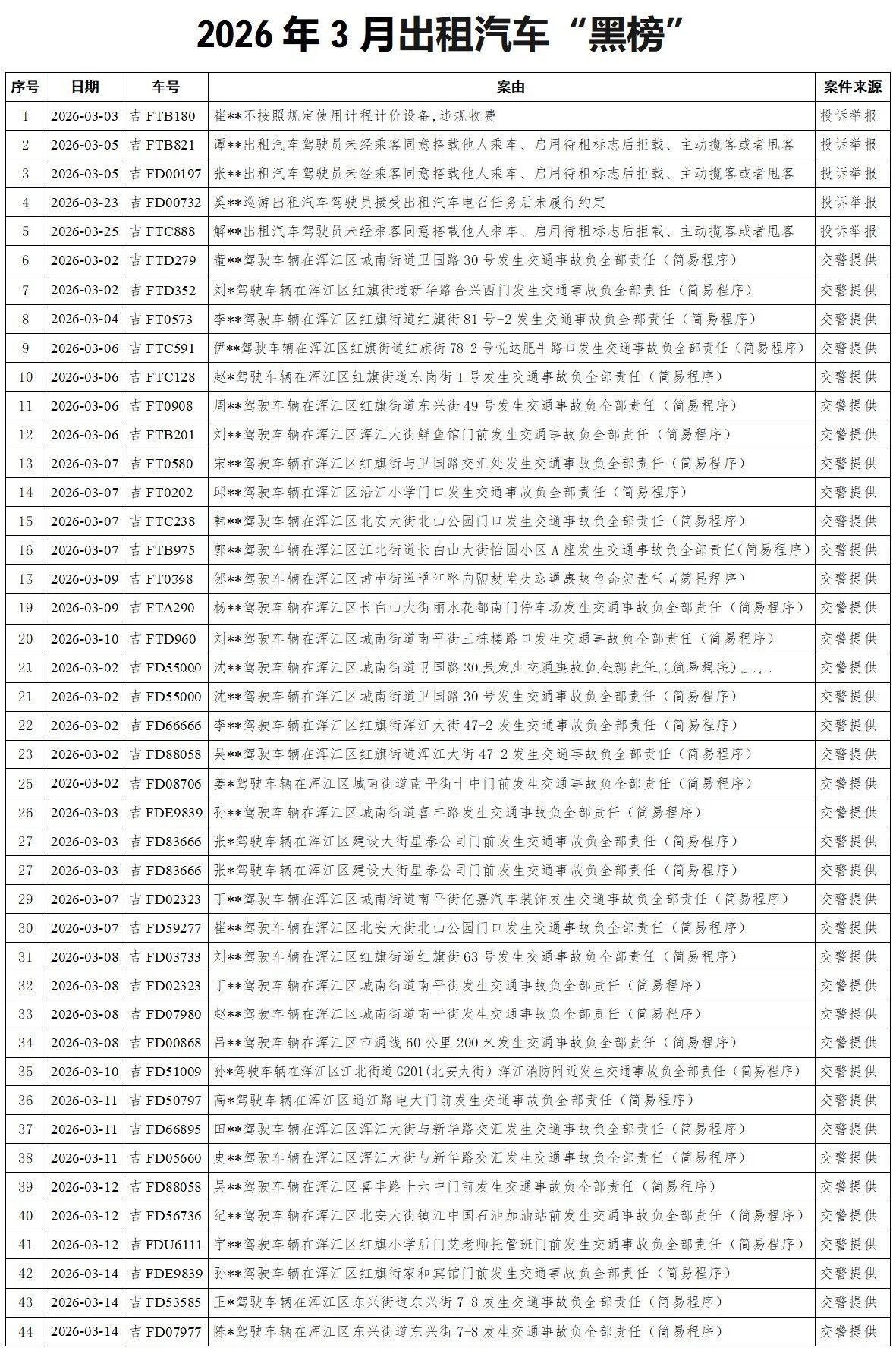 为进一步提升出租汽车行业文明服务水平,现将2026年3月份“城市流动新名片”创建活动情况予以公告:出租汽车“红榜”29人,主动归还丢失物品29人次,其中:归还手机13部,钥匙5把,包5个,其他物品7件;出租汽车“黑榜”44人,其中:涉嫌出租汽车驾驶员未经乘客同意搭载他人乘车、启动待租标志后拒载、主动揽客或者甩客3人,涉嫌巡游出租汽车驾驶员接受出租汽车电召任务后未履行约定1人,不按规定使用计程计价设备,违规收费1人;发生交通事故负主要责任以上39人。经调查,3月份市区内出租汽车交通事故74起,其中:承担事故全责39起,占总数52.7%;;承担次要责任和无责任35起。
