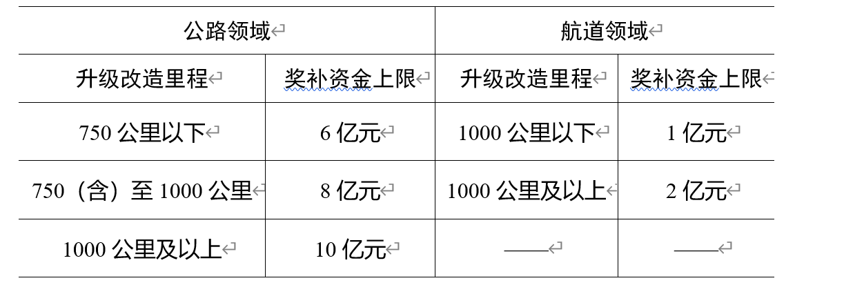 财政部根据竞争性评审确定的年度支持名单和交通运输部提出的资金安排建议,结合财力情况,按照“奖补结合”方式安排资金。其中公路、航道领域奖补资金分别核定,按照交通运输部核定总投资的一定比例予以奖补,东部、中部、西部地区奖补比例分别为40%、50%、60%。实施第一年按照每个示范区域奖补资金的40%予以补助,用于启动相关工作;后续根据绩效评价结果予以奖励。实施期内奖补资金具体根据各省份开展的公路、航道数字化升级改造里程规模确定,如下表所示。